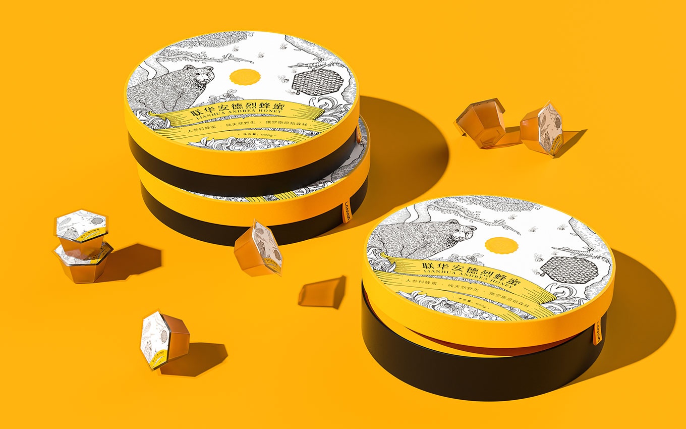 我們獨具創意的蜂蜜包裝設計與眾不同,與傳統的包裝方式有所區別,使產品的使用體驗更加人性化。黑色與黃色的搭配巧妙地突出了蜂蜜產品的行業屬性,給人以強烈的視覺沖擊力,讓人一眼就能辨認出產品所屬的行業。